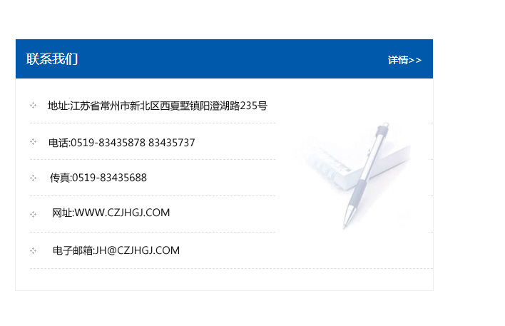地址:常州市新北區友邦商務大廈1幢16、17層  電話:0519-85101652  傳真:0519-85112595  郵編:213022  網址:www.cz-jiayue_cn.xyfxsd.com  郵箱:xiajifengaa@163.com